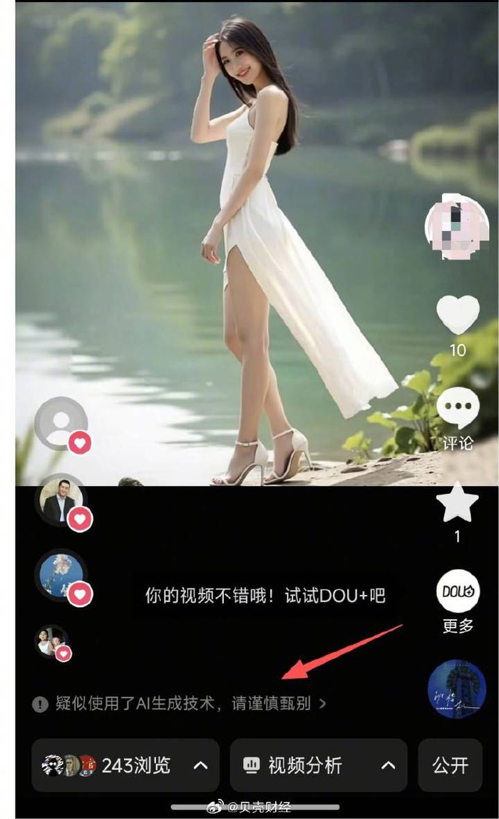 9月8日,贝壳财经记者使用AI生成了一个“写实风格湖边白色连衣裙中国美女”的视频,并在消除AI水印后通过上述六家平台发布,且未主动标注为AI生成内容,发布过程同样“畅通无阻”。