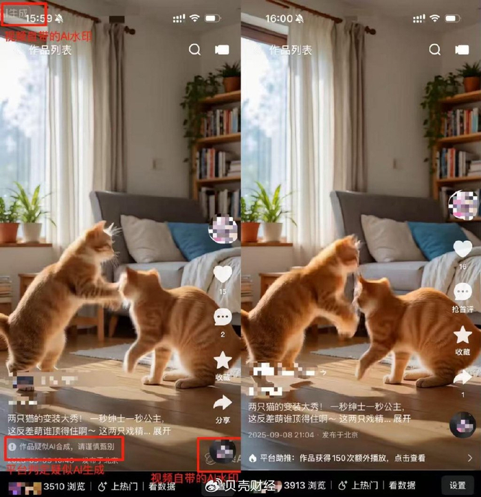 9月15日,贝壳财经记者再次打开上述已发布的AI视频发现,仅有抖音平台发布的“猫咪变装”视频画面不论有无水印均出现了“疑似使用了AI生成技术,请谨慎甄别”的文字说明。快手则只识别了带有AI水印的“猫咪变装”视频,并进行了AI生成相关提醒。