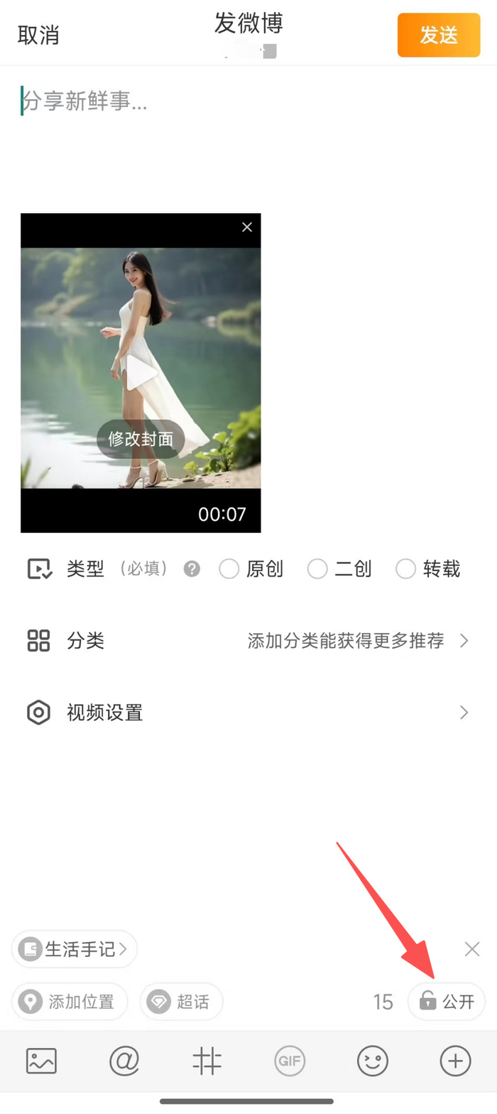 微博的AI生成内容标识选项隐藏在右下角的“公开”按钮中。