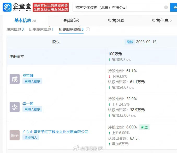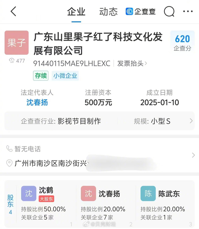 据悉,广东山里果子红了科技文化发展有限公司由小沈阳(沈鹤)持股50%,沈春阳(沈春扬)持股20%并担任法定代表人。近日,该公司入股描声文化传播(北京)有限公司,描声公司为一家艺人培训公司。#肖战容祖儿 这是小沈阳的女儿#