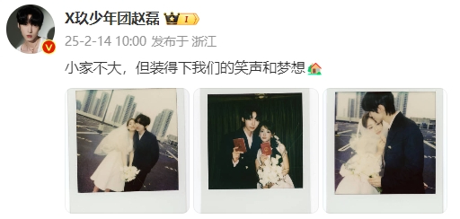 2月14日上午,X玖少年团成员赵磊也在社交平台上宣布结婚喜讯:“小家不大,但装得下我们的笑声和梦想。”