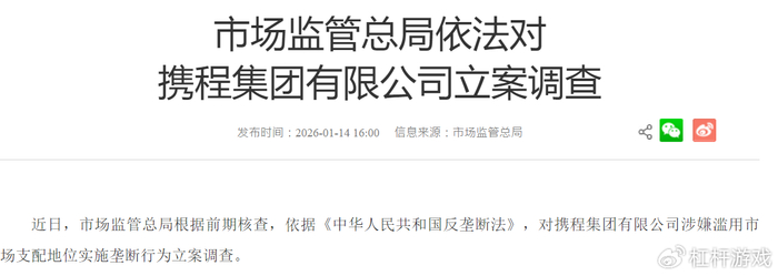 2026年1月14日,市场监管总局公告,依据《中华人民共和国反垄断法》对携程集团涉嫌滥用市场支配地位行为正式立案调查。