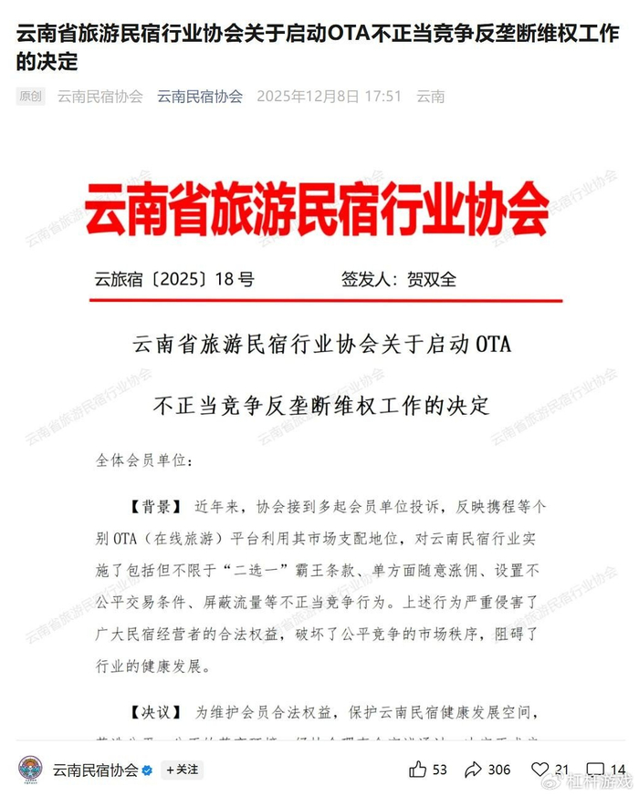 再就是近期的2025年12月,云南省旅游民宿行业协会发布了一份措辞严厉的声明,决定启动对OTA平台的反垄断维权工作。