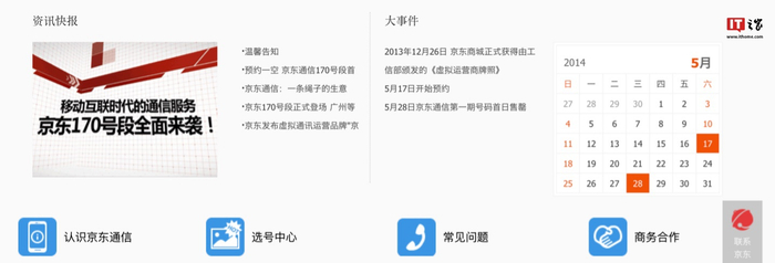 京东通信于 2014 年 5 月 17 日开放预约,同年 5 月 28 日正式发售,首批开放城市为上海,南京,杭州,北京,广州,成都,哈尔滨,武汉。IT之家查看官网获悉,目前官网大部分信息均停留在 2014 年 5 月。