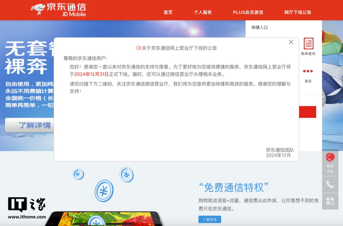 IT之家 12 月 31 日消息,京东通信官网显示,京东通信网上营业厅将于今日正式下线,用户可通过微信营业厅办理相关业务。