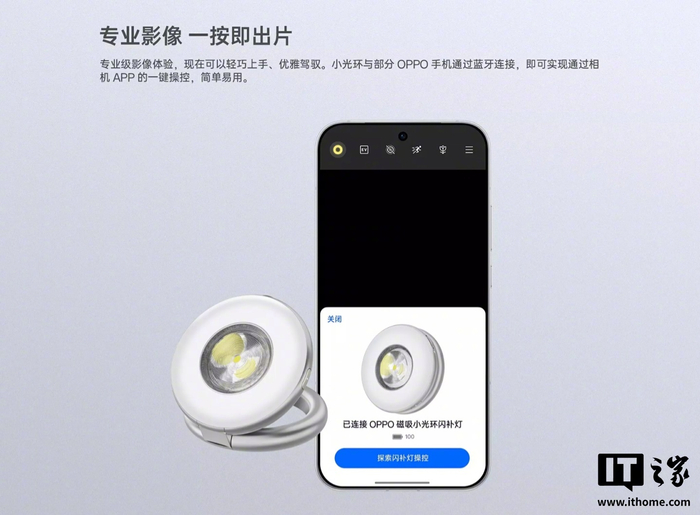 【OPPO 磁吸小光环闪光灯发布:内置补光 / 闪光灯,磁吸感应自动开机、兼容苹果 iPhone】OPPO发布磁吸小光环闪光灯,支持补光/闪光一体设计,兼容iPhone,内置500mAh电池,支持8挡亮度调节和3挡色温调节,直播、视频拍摄更轻松。#OPPO新品# #手机配件#