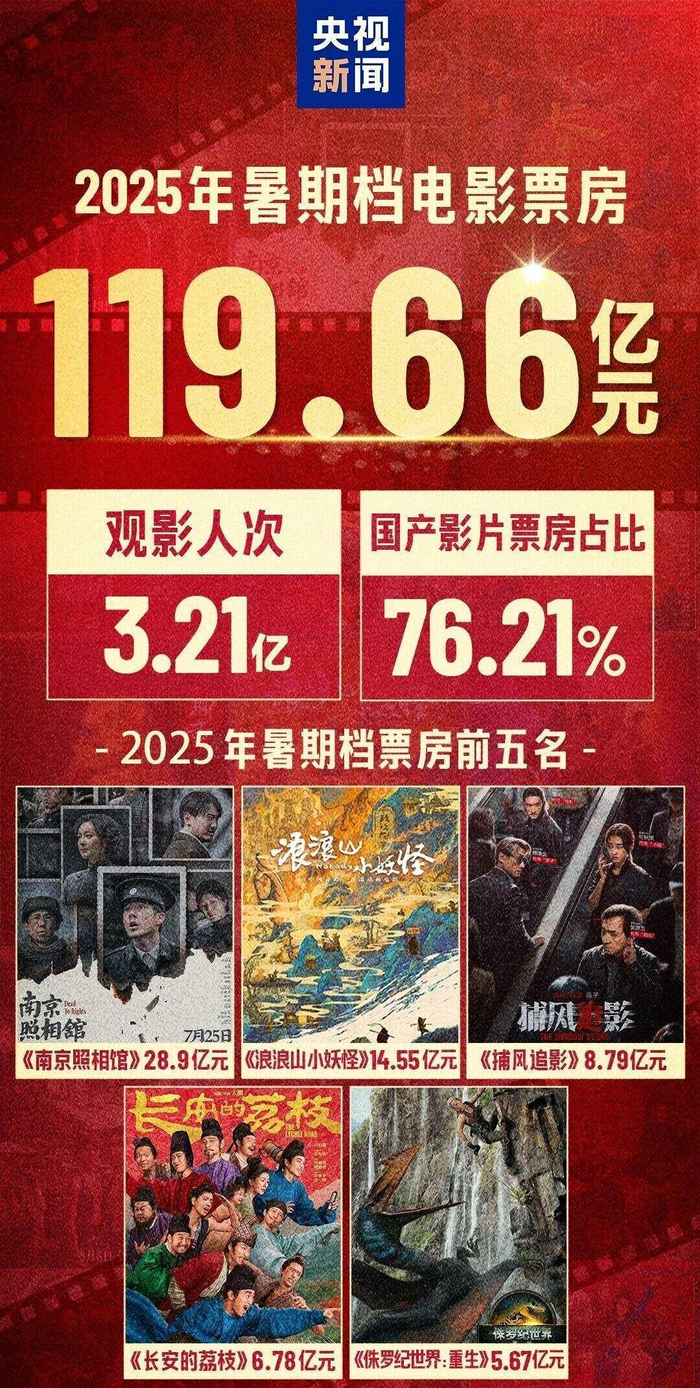 根据国家电影局统计,2025年暑期档(6月1日至8月31日)电影票房为119.66亿元,观影人次为3.21亿,同比分别增长2.76%和12.75%,国产影片票房占比为76.21%,超过去年同档期。