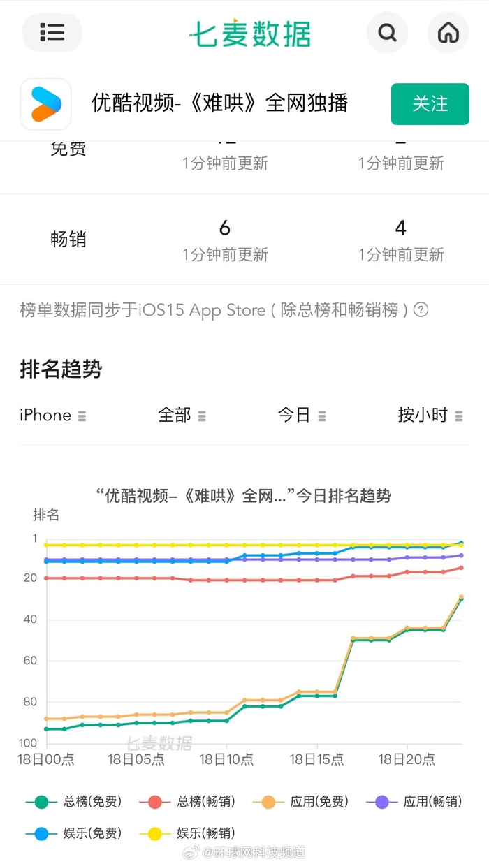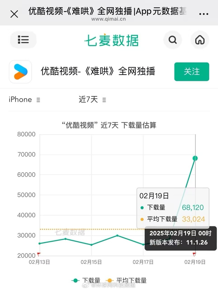 剧集的热度也带动了优酷App的下载量暴涨,根据国内知名移动应用数据分析平台七麦数据显示,《难哄》上线第2天即2月19日,优酷App在iPhone端下载量较剧集上线前大涨近200%,目前居娱乐榜TOP2。