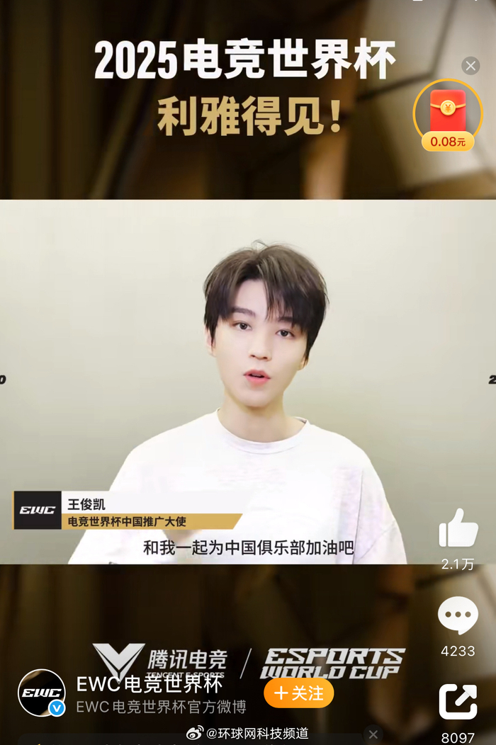 2025年7月6日,沙特利雅得电竞世界杯(Esports World Cup, EWC)组委会联合腾讯电竞正式官宣,王俊凯成为2025电竞世界杯中国唯一推广大使。
