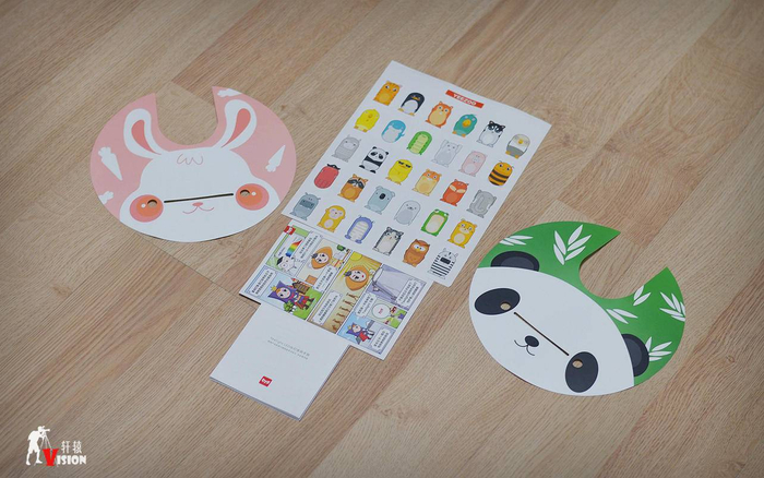 配件包括说明书*1、电源适配器*1、产品使用说明手册*1、儿童卡通贴纸*3,小熊猫与小兔子的贴纸,比较吸引小朋友的设计,可以贴在台灯的底座表面,也不会影响到台灯的开关、亮度调节。