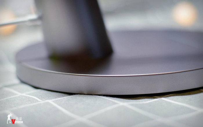 底座采用金属配重,四周设计有长条状的防滑条,增加了放置在桌面上的稳定性。下面是台灯的名牌区,上面备注有台灯的各项参数。