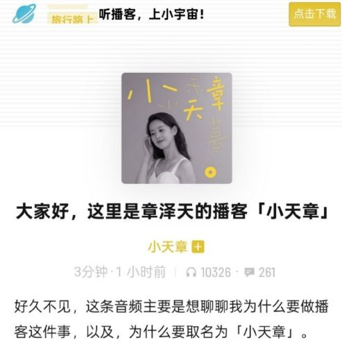 1月12日,章泽天的个人播客“小天章”,在小宇宙APP上线。在第一条播客内容中章泽天介绍,“这条音频主要是想聊聊我为什么要做播客这件事,以及,为什么要取名为‘小天章’。”