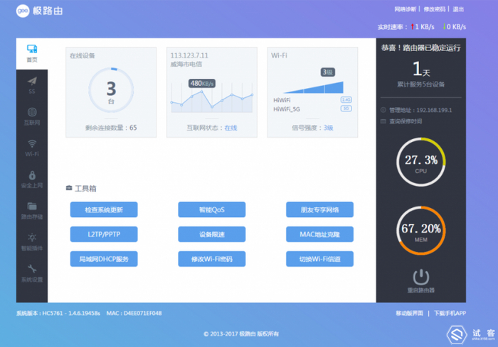 现在这台路由器仍在服役,放到家里做为一级路由。因为极路由开放Root权限,Root之后可以实现更多的功能,比如说安装$$插件等,这里就不多解释了。
