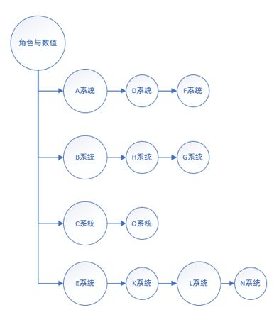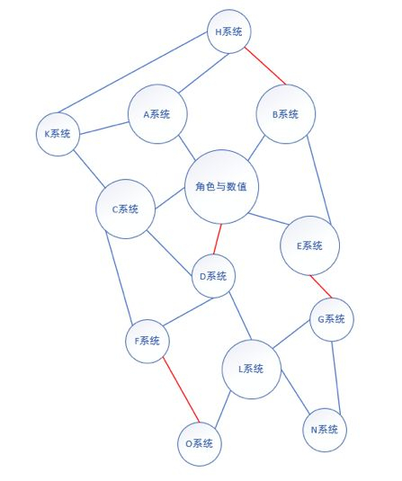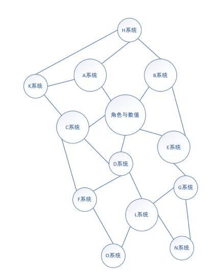这张图的结构,对游戏设计师来说应该很熟悉。一名游戏设计师,对他做过的、乃至玩过的每个游戏,都应该可以画出一张系统结构图,经验丰富一些的,可能接触一款新游戏后几个小时内就能画出来。对中国开发的很多网游、页游、手游来说,这件事情尤其容易,因为很多游戏的系统拆解图、玩法拆解图、数值拆解图……由于众所周知的原因,看起来都相当相似。这种结构,多见于以战斗为核心,数值重要性很高的网络游戏、卡牌游戏等品类中,也是中国的游戏行业中最流行的游戏系统结构。