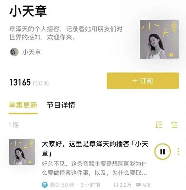1月12日,章泽天个人播客“小天章”正式在小宇宙APP上线,首期不到3分钟的自我介绍音频一经发布便引发广泛关注。