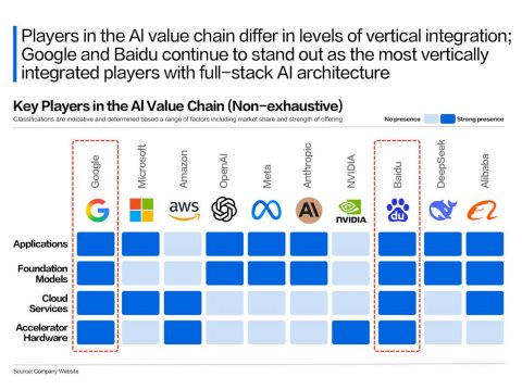 这也是谷歌和百度的优势,甚至在生态方面,谷歌和百度的优势更为巨大:它们是国际大厂中为数不多的拥有全栈布局的厂商。