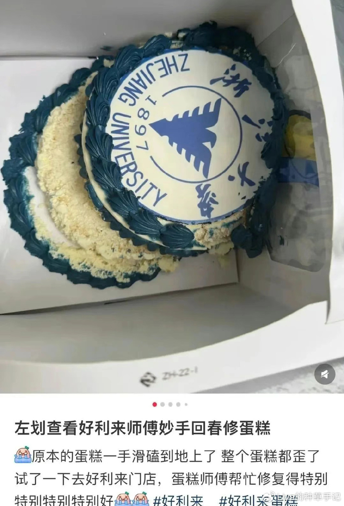 有网友分享,家人为其定制了 "毕业蛋糕" 纪念研究生生活,却因路途颠簸意外摔坏。