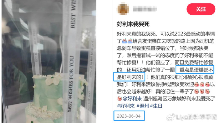 正值毕业季,一则关于 "好利来免费修蛋糕" 的帖子刷爆社交平台。