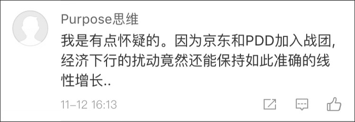 也有网友表示怀疑,在京东和拼多多加入战团的情况下,还能保持如此准确的线性增长值得怀疑。