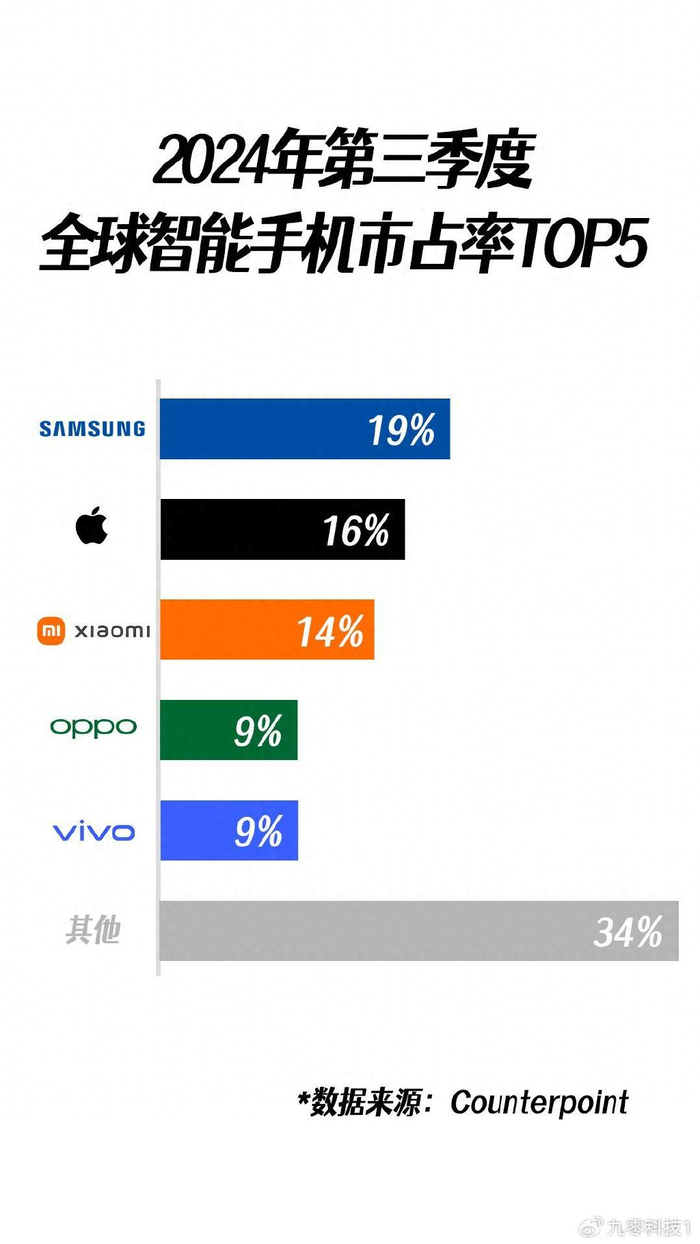 (OPPO跻身2024年Q3季度全球智能手机市占率TOP4)