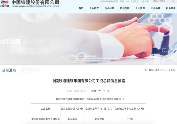中国铁建近日在其官网披露了2024年度工资总额,信息显示,该集团2024年应发工资总额为495.33亿元,在岗职工年平均人数为285248人,在岗职工年平均工资为17.18万元。