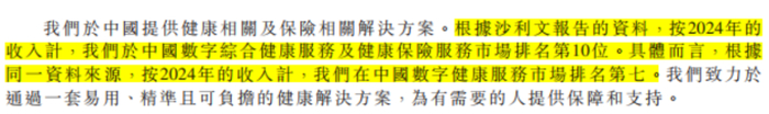 根据沙利文的报告,按收入计算,轻松健康2024年在中国数字综合健康服务及健康保险服务市场位列第10位,已经成为中国数字健康与保险服务领域的重要玩家,在中国数字健康服务市场的排名更是来到第7位。