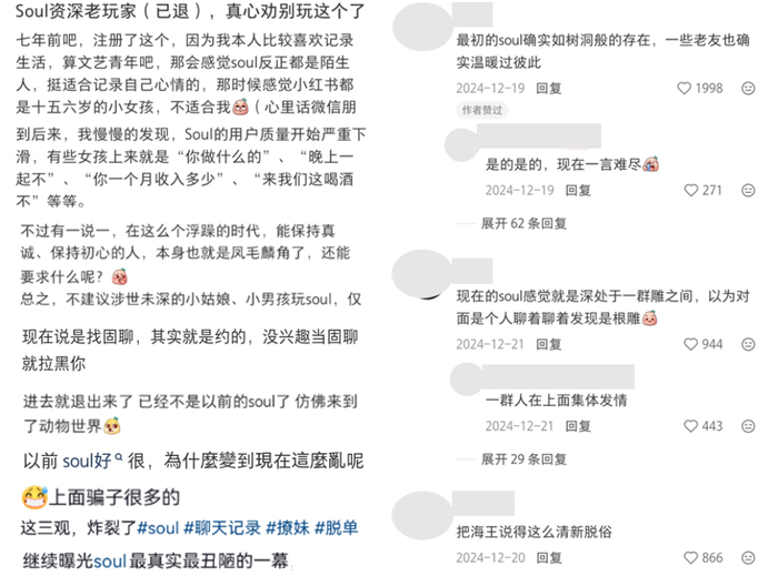 在抖音、小红书等平台上随手一搜,基本都是Soul的吐槽帖子:骗人的、出轨的、炸三观的、海王横行、动物世界……平台氛围逐渐变味,久而久之,也就有一些老玩家退了。
