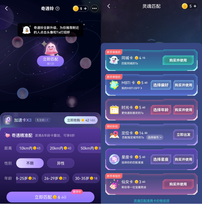 作为一款交友软件,Soul的社交功能也处处都是付费点。比如说“奇遇铃”这一part,能通过定位帮你结识附近的人,但如果你想手动筛选距离、年龄?加钱!想进一步提高匹配概率?买道具卡!
