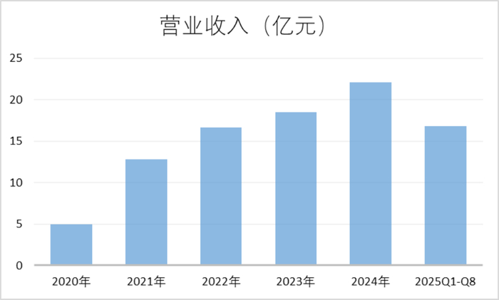 营收规模也持续增长,2024年达22.1亿元,相较2020年复合增长超45%。2025年前八个月,营收同比增长18%至16.83亿元。
