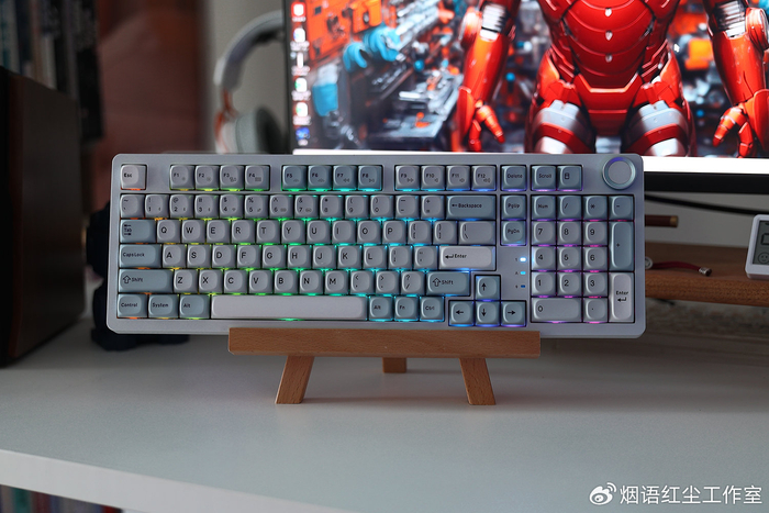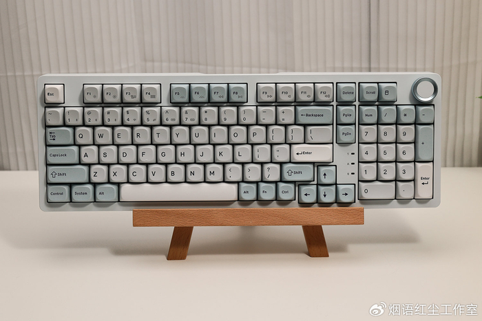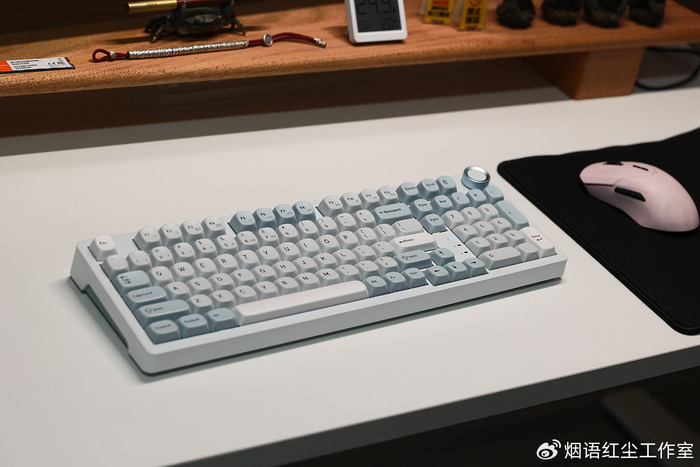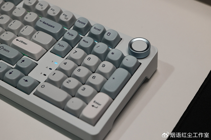 最让我爱不释手的,是键盘右上角那颗精致的金属旋钮。表面带有细腻的防滑纹路,旋转阻尼感恰到好处。它不仅是便捷的音量调节器,更能通过驱动自定义为多媒体控制键,将实用与格调完美结合。而定位板上若隐若现的青花瓷图案,则在不经意间将东方美学的细节感拉满,每次注视都是一种享受。