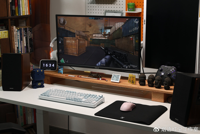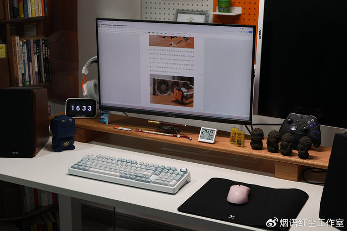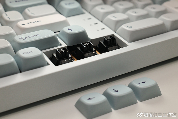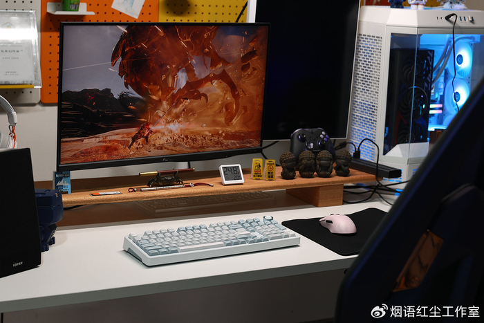 配件清单更是丰富得令人惊喜,除了键盘主体,还附赠了Type-C编织数据线、带有专用收纳仓的2.4G无线接收器、拔轴器与拔键器。我选择的“凝”配色,以纯净的白色为基底,搭配浅灰绿的键帽,辅以细微的青金色点缀,整体视觉清新淡雅,却能轻松驾驭从简约现代到电竞炫酷的各种桌面风格。
