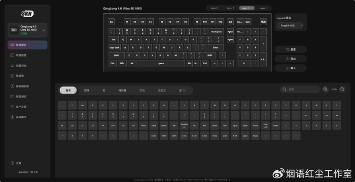 SKN青龙4.0Ultra支持网页驱动,无需下载客户端,通过浏览器即可访问,界面直观易用。除了灯光管理,它还支持全键位重映射、宏命令编程、固件更新等高级功能,赋予了键盘极高的可玩性。