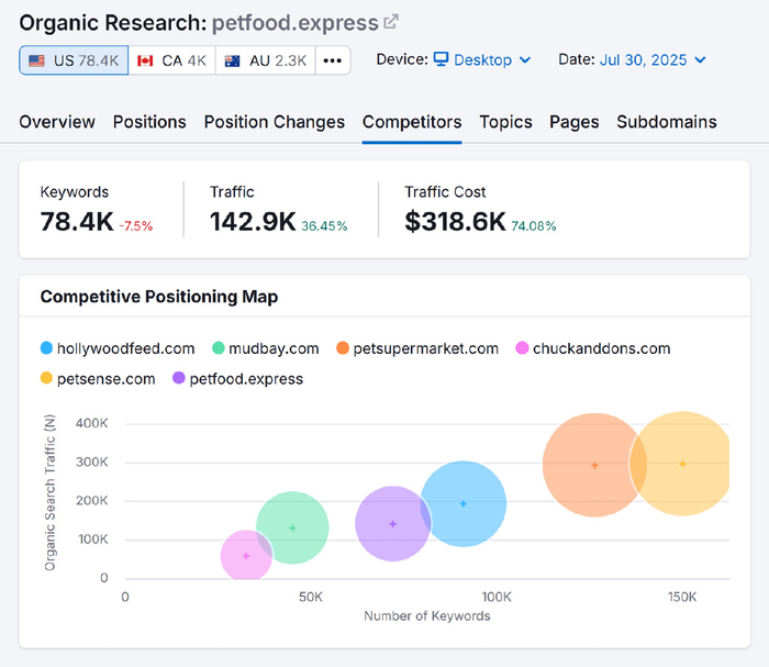 只需将您的域名放入自然搜索工具中。前往“竞争对手”标签,您就会看到竞争定位图。