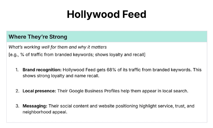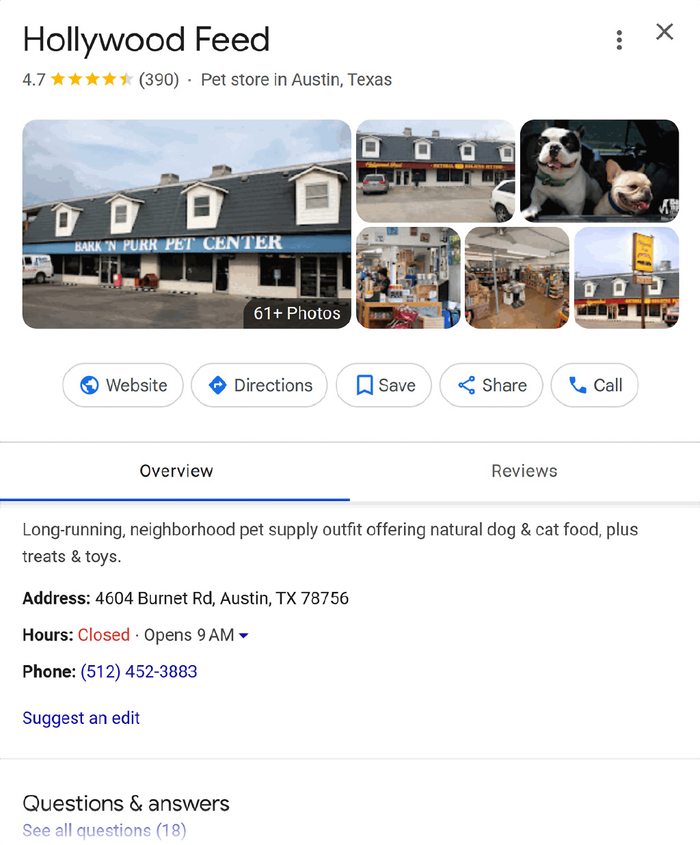 如果您的竞争对手有实体店,请在 Google 搜索和 Google 地图中搜索他们的品牌名称 + 城市(例如“Hollywood Feed Austin TX”)。
