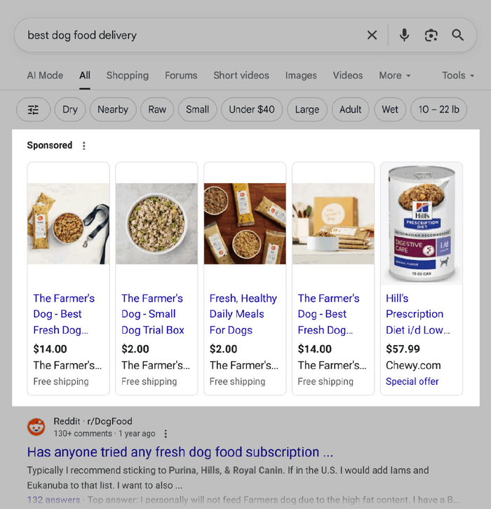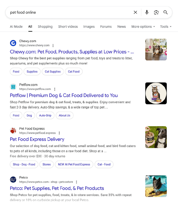 想想“最好的狗粮配送”或“我附近最好的宠物店”。