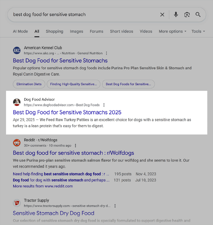 然后,在 Google 搜索中,通过搜索广泛、高意图的关键词来查找AI 概览。(或者在 AI 模式下查看结果。)