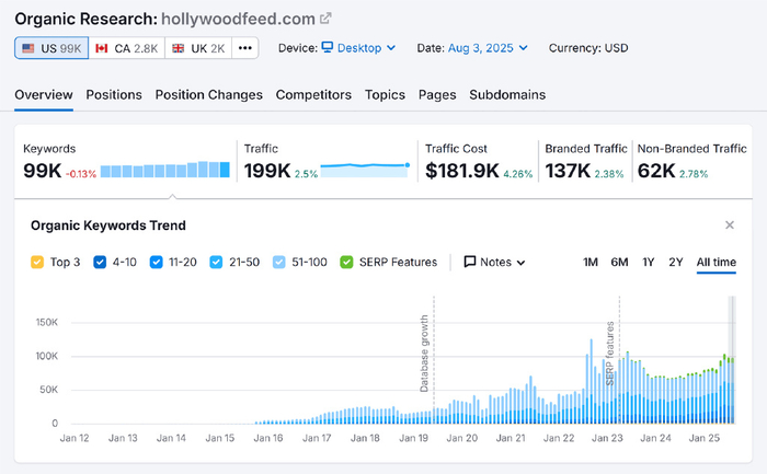 Hollywood Feed 的付费搜索流量仅为 8.4K。看来他们更看重 SEO,而不是广告。