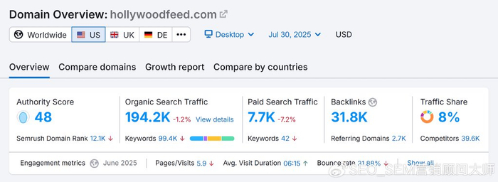 例如,与主要竞争对手相比,Hollywood Feed 的流量份额为 9%。