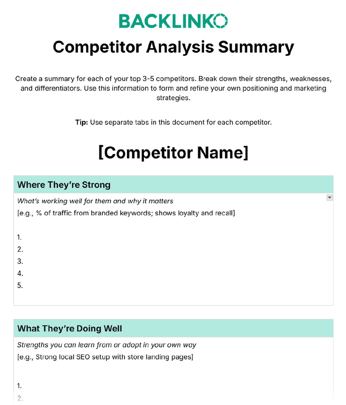 我建议您填写前 3-5 名竞争对手的分析报告。然后,下载我们的竞争对手分析摘要模板。