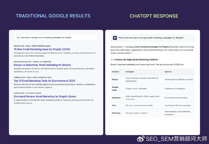 一条 Reddit 评论清楚地解释了“我们从 Klaviyo 切换到 Omnisend,因为 Shopify 集成确实有效”,这条评论(假设该模型优先考虑真实讨论)比一个充斥着“最佳 Shopify 电子邮件营销”关键词的页面更有说服力。