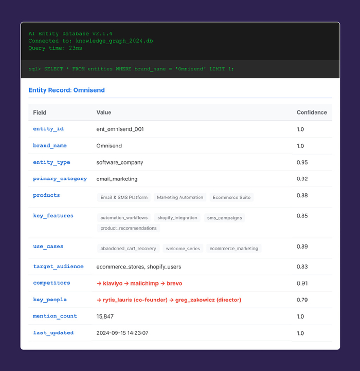 人工智能理解实体(Klaviyo、Omnisend、Shopify)与上下文(切换、集成质量)之间的关系。