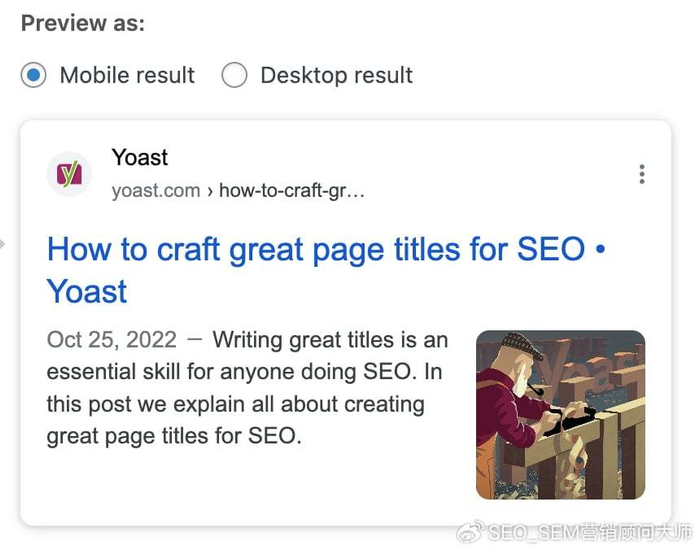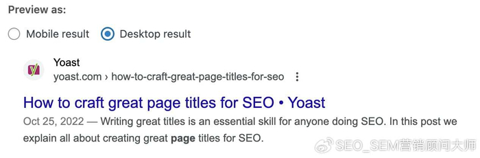 如果你的SEO标题宽度不对,谷歌搜索结果可能会截断部分内容。结果可能会因你使用的设备而异。这也是为什么你也可以在Yoast SEO的搜索外观部分查看你的SEO标题在移动端和桌面端搜索结果中的表现。该工具默认为移动端版本,但你也可以切换到桌面版查看。