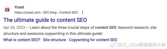 这就是HTML标题标签,也称为SEO标题。当你在搜索引擎中查找某项内容时,会得到一个以片段形式出现的结果列表。看起来像标题的部分是SEO标题。SEO标题通常包含帖子标题,也可能包含其他元素,如网站名称。甚至还有表情符号!