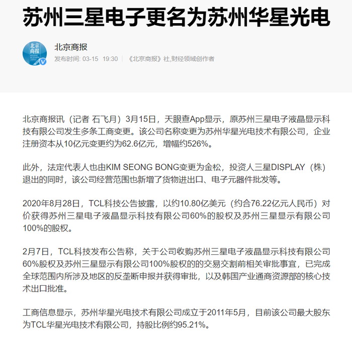 今年四月,TCL发表公告,苏州三星电子液晶显示科技有限公司已更名为苏州华星光电技术有限公司(简称“苏州华星技术”),苏州三星显示有限公司已更名为苏州华星光电显示有限公司(简称“苏州华星显示”)。