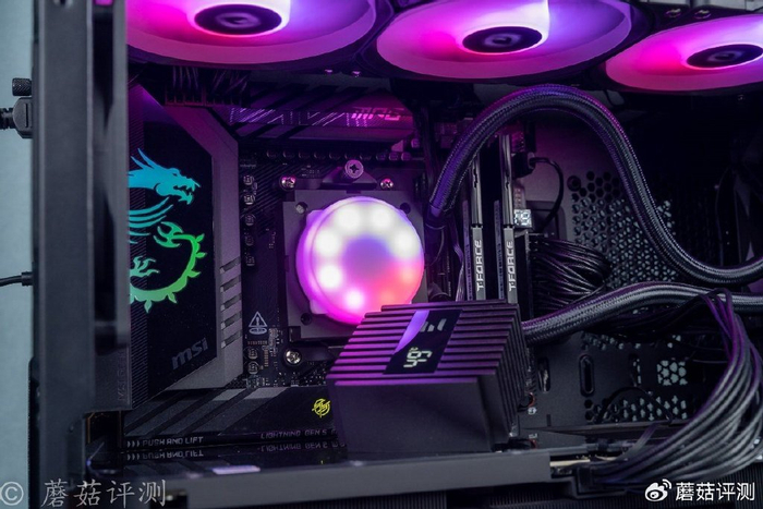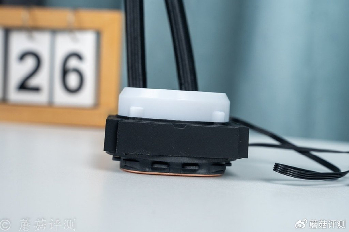 ▼水冷头顶部格栅状的顶盖,透过格栅,可以看到下面圆形的ARGB灯效,视觉观感很不错。