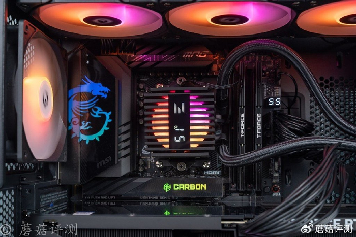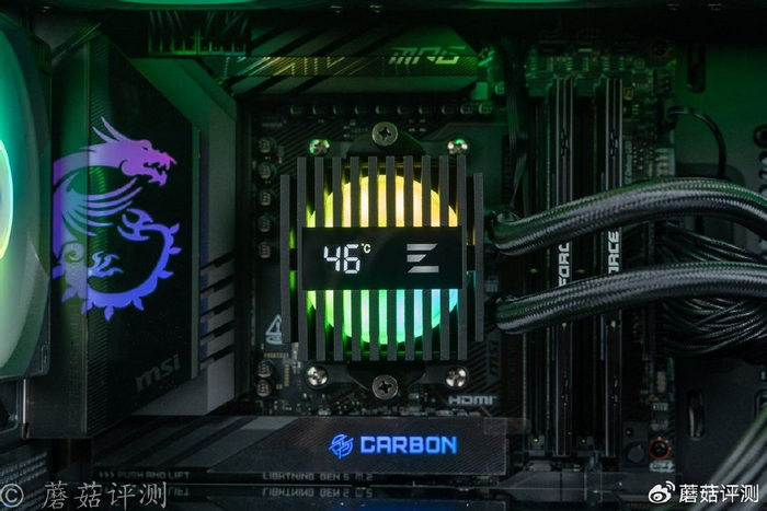 ▼水冷头顶部的数显屏幕,会实时显示处理器的温度,旁边还会亮起一个思民的LOGO。