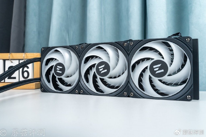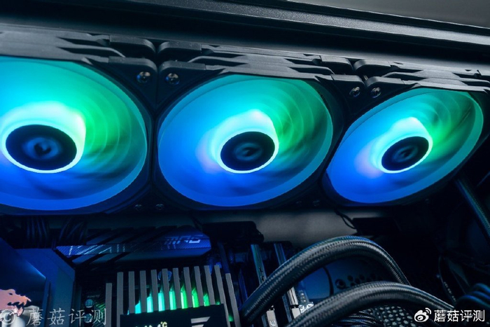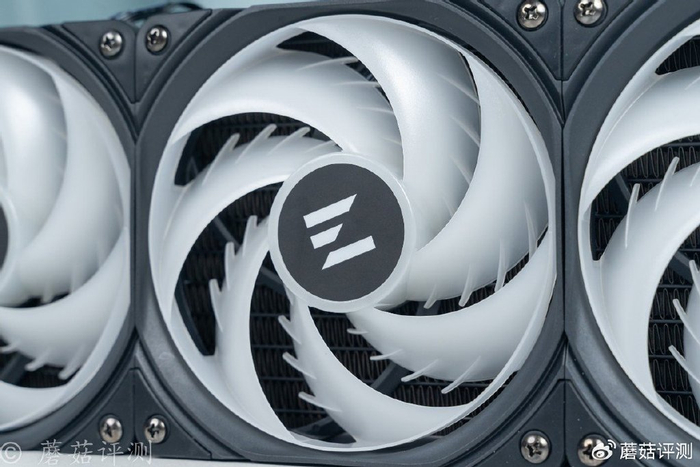 冷排风扇部分,采用特殊的鲨鱼鳍环形扇叶,造型酷炫,风阻小、运行稳定、还能梳理风道,乳白色的扇叶还有一定的柔光效果,视觉观感很漂亮。