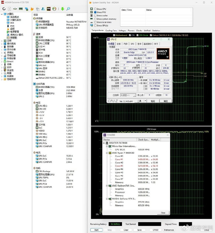 ▼简单跑个CPU-Z的压力测试,处理器功耗在145W左右,全核心睿频5.4GHz,温度90℃,南桥56℃,供电57℃,显卡核心49℃,固态54℃。