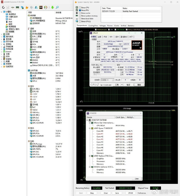 ▼单烤FPU测试,处理器功耗在145W左右,全核心睿频4.7GHz,温度92℃,南桥55℃,供电60℃,显卡核心49℃,固态53℃。机箱内部的整体散热情况还是非常不错的,冷排风扇转速提高,机箱内部的硬件温度就有明显降低,不错不错。
