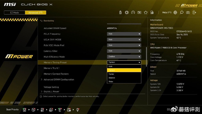 ▼内存方面,除了常规的设置之外,微星还贴心的加入了高带宽、低延迟模式,打开选择合适的选项,就能获得性能方面的提升。